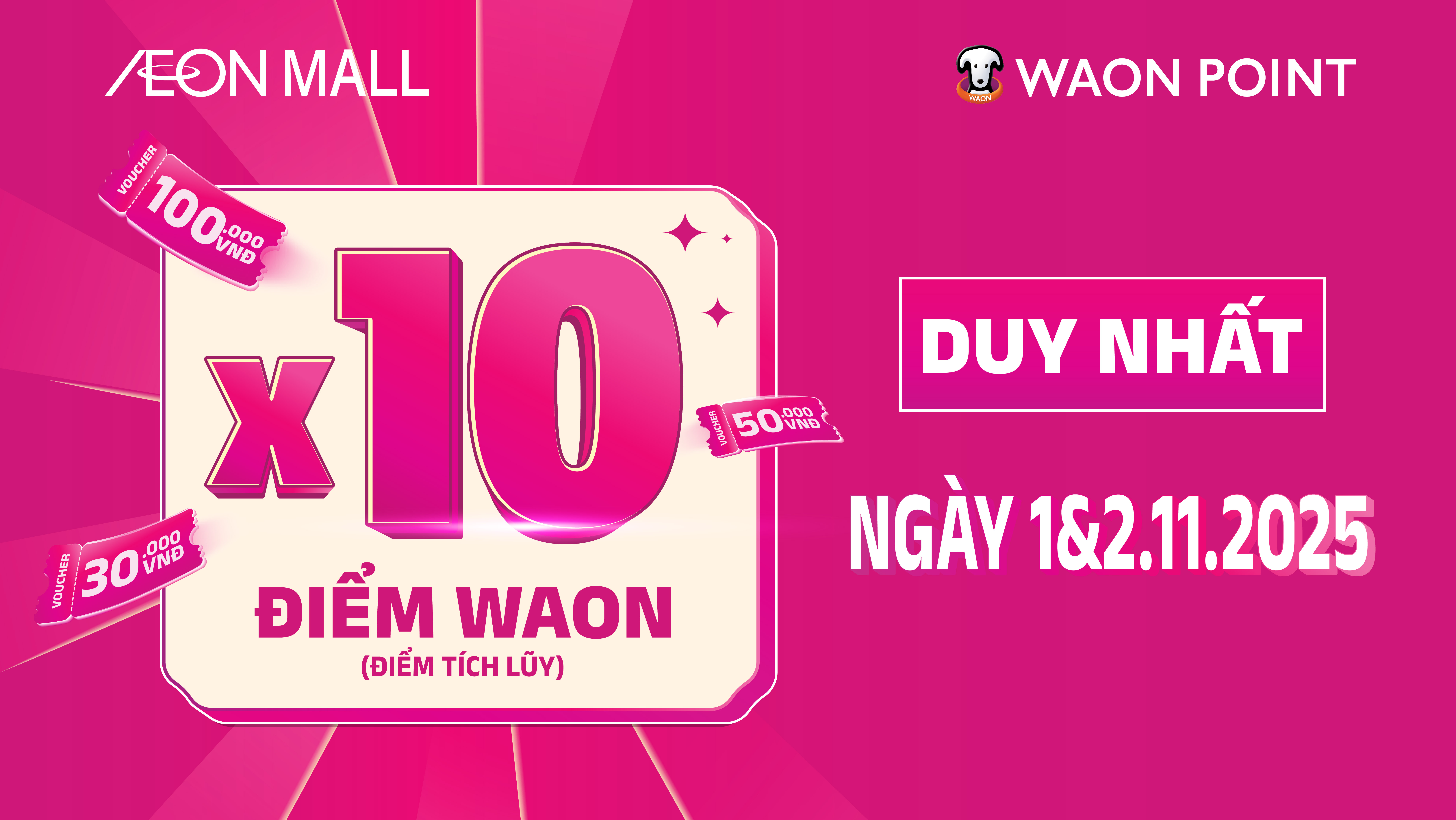 - 10.1. Trong 2 ngày 1 đến hết ngày 2 tháng 11 năm 2025 (tổng cộng 2 ngày), với mỗi 10.000 VNĐ thanh toán thành công cho các giao dịch mua sắm hợp lệ thông qua thanh toán không tiền mặt qua máy cà thẻ Payoo do AEONMALL Việt Nam vận hành, sau khi đã trừ tổng giá trị WAON voucher và các chương trình khuyến mại khác, Thành Viên nhận ngay được mười (10) Điểm WAON vào tài khoản Thành Viên, ngoại trừ một số mặt hàng, sản phẩm không được khuyến mại theo quy định pháp luật hiện hành.