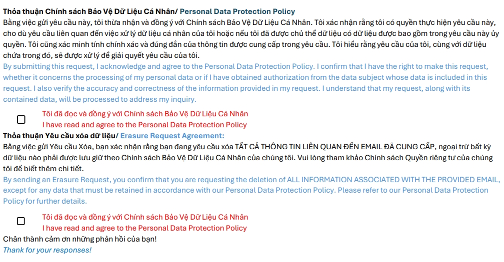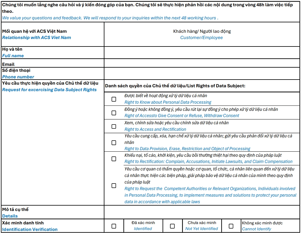 Vui lòng tải Phiếu Yêu Cầu Thực Hiện Quyền Chủ Thể Dữ Liệu và gửi lại cho chúng tôi qua email privacy@acsvietnam.com.vn.